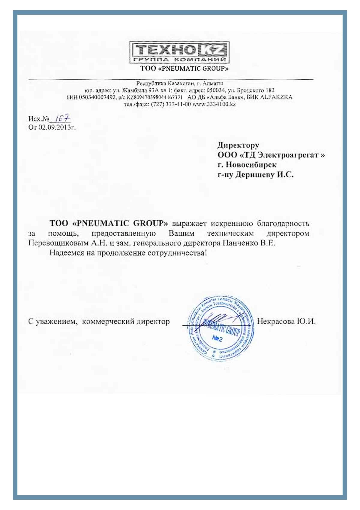 Отзыв контрагентов о компании ООО «ТД Электроагрегат» и  исполненном проекте для ТОО "PNEUMATIC GROUP" г. Алматы, Республика Казахстан